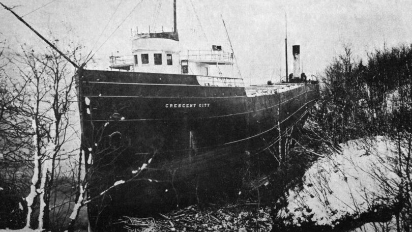 Shortly after midnight on November 28, 1905, the Crescent City dropped anchor in 90-feet of water on Lake Superior. A nor’easter began to blow and the 406-foot steamer was digging in to ride it out several miles from the port in Duluth. After successfully riding the storm for three hours, a great gust of wind struck the ship’s starboard bow, pulling the anchors free from the lake bottom. Capitan Frank Rice ordered full speed ahead with the rudder hard to port, but the 60 to 70 MPH winds kept the ship from making any headway.