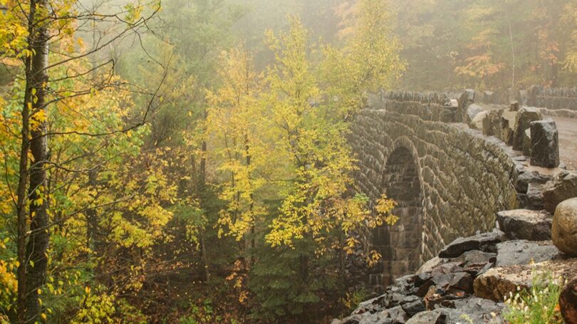 Travelers come upon the Stewart Creek stone-arch bridge in a bend of an unpaved section of Skyline Parkway, where the bridge reveals its mammoth, craggy, Picturesque stonework over a beautifully wooded ravine. The bridge was constructed around 1925 as part of a new section of the scenic parkway. It conveys a mood rather than a particular style and was designed as much for its ornamental effect as it was for its function.