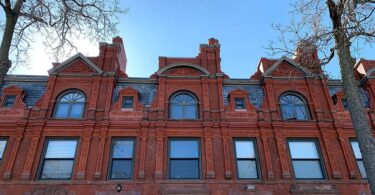 The massiveness of the Swindon Apartments is in stark contrast to the intricately-designed Swinford Townhomes next door. But its grand scale and proportion continue to hint at its elegant past. Its red-brick exterior rises to a cornice with dentils, heavy brackets, and carved open-mouthed lion heads., and a full-height, round bay graces the northeast corner of the building.